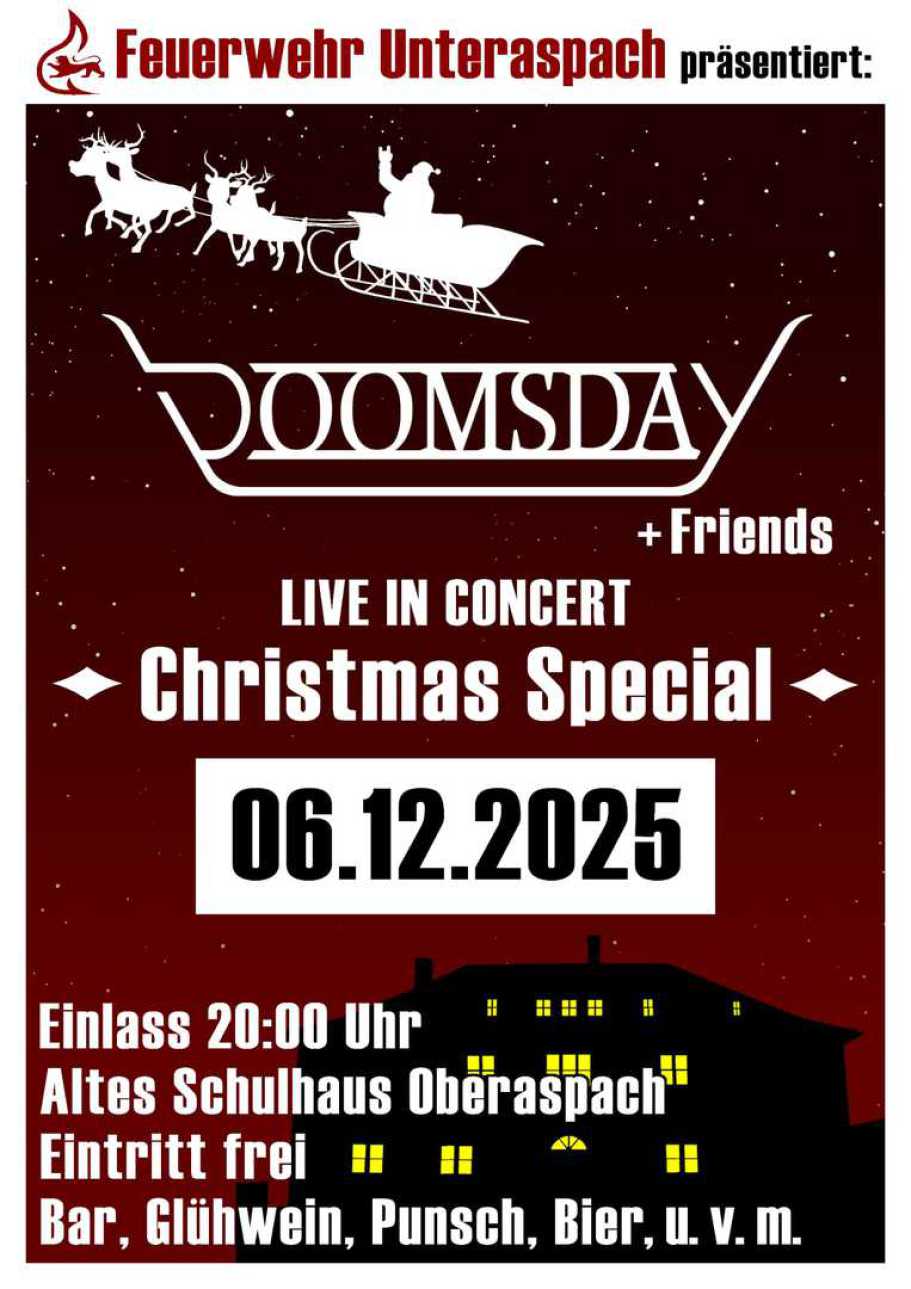 Feuerwehr Abteilung Unteraspach präsentiert: Doomsday Weihnachtskonzert am 06.12.2025, Einlass 20 Uhr Schulhaus Oberaspach, Eintritt frei